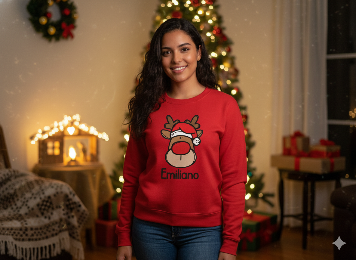 Este diseño de "Reno con Gorrito" es el favorito absoluto de los niños. Olvídate de la ropa rígida; estos buzos son básicamente un abrazo hecho prenda. Perfectos para abrir regalos el 25 de diciembre o para tardes de películas y chocolate caliente. ☕
